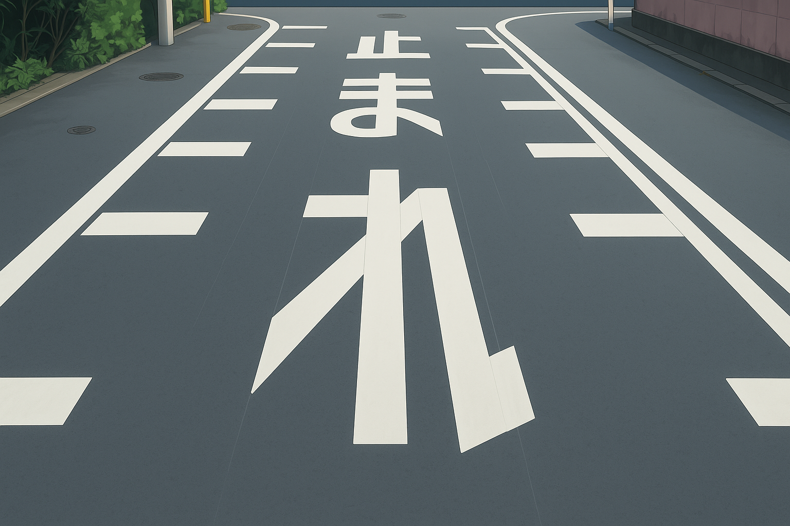 – 路面に書かれた白文字「止まれ」(法定外表示):義務なし(注意喚起のみ)。